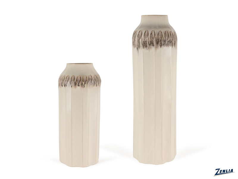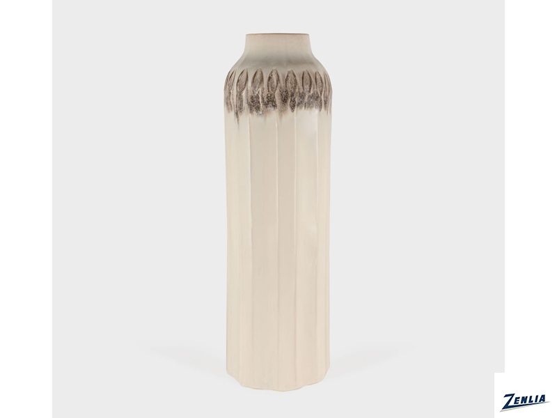 The ceramic floor vase features a tall, cylindrical shape that gently tapers towards the top, giving it a sleek and modern look. The vase It features distinctive dark brown and black markings that resemble a row of elongated leaves encircling below the neck, adding a decorative contrast to the otherwise minimalist design. The vase is available in two different sizes and is sold individually.