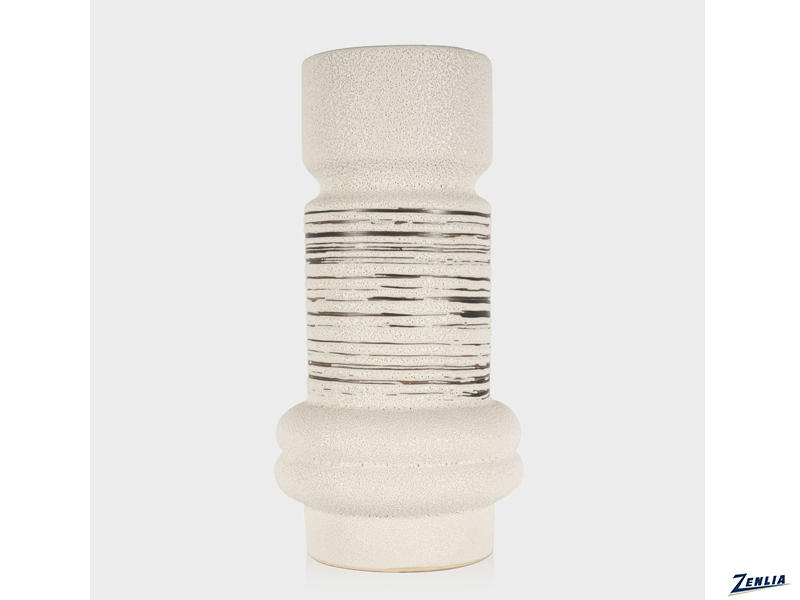 The ceramic table vase, large is a stylish and modern decorative accessory. It features a sleek, cylindrical shape with wider sections with a textured design that combines smooth white ceramic with horizontal black striations. The texture is quite unique, with the smooth ceramic surface interspersed with areas of raised, horizontal lines that add depth and visual interest. This combination of smooth and textured surfaces gives the vase a contemporary and artistic look. Measuring 6 inches in width, 6 inches in depth, and standing 12 inches tall, this vase is perfect for adding a touch of elegance to any modern home decor.