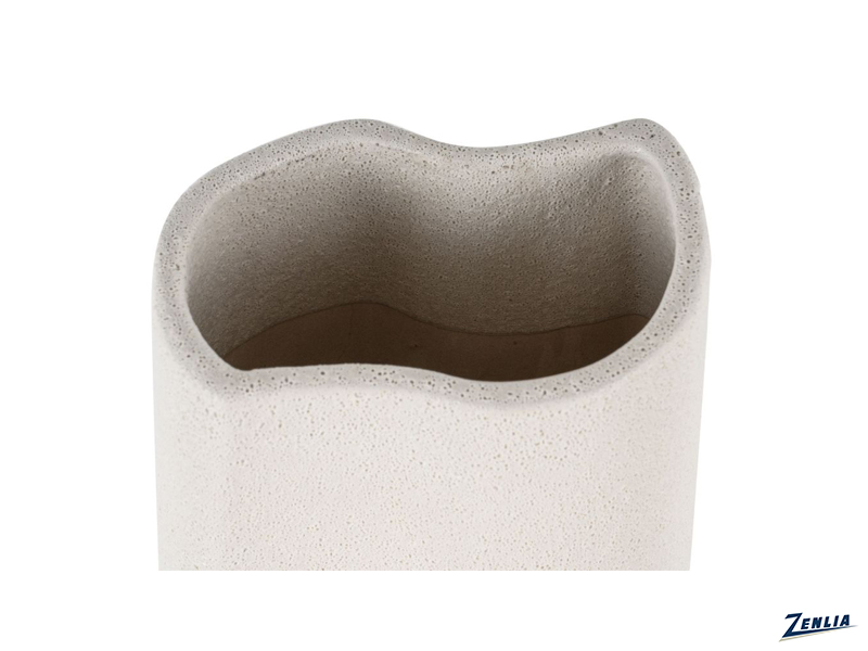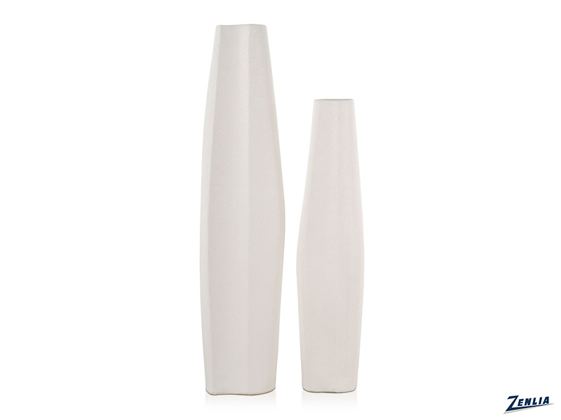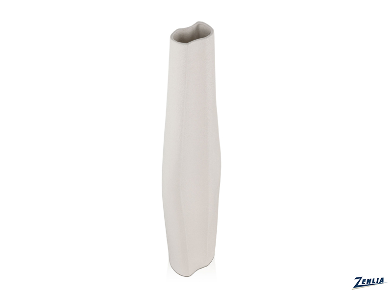 The Ceramic Floor Vase is a striking piece that embodies a modern and contemporary design. Its cylindrical shape adds to its sleek and minimalist aesthetic, making it a perfect decorative element for any space. The vase is white, which enhances its clean and sophisticated look. Measuring 7.5 inches in width, 5 inches in depth, and 31.5 inches in height, it stands tall and elegant. The vase features unique textures that adds depth and character to its modern design. This subtle transition creates a visually interesting effect, enhancing the vase's overall aesthetic. This variation in texture not only adds to its visual appeal but also gives it a distinctive, handcrafted feel