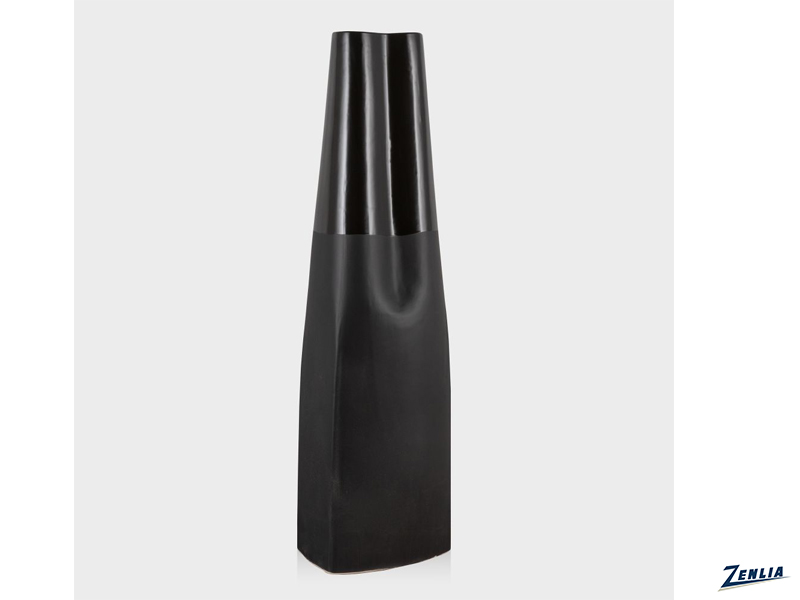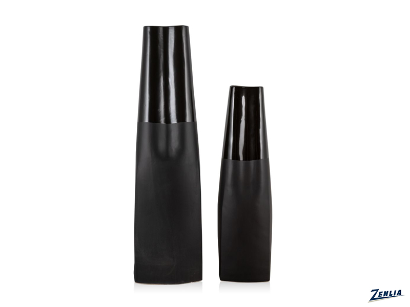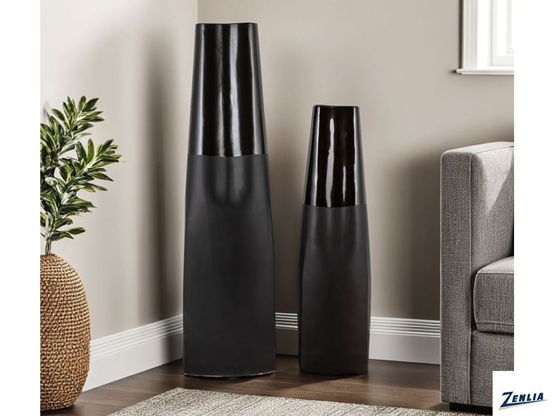 The black ceramic floor vase has a sleek and modern design. Its glossy finish gives it a smooth texture that reflects light beautifully. The vase is tall and slender, tapering slightly towards the top, which then extends into a narrower neck before opening at the mouth. This elegant and simple silhouette makes it versatile for various decorative styles. It has a slightly wider base, providing stability and a balanced look. The smooth, uninterrupted surface of the lower half enhances its modern aesthetic, making it a striking piece placed on the floor. It comes in two sizes, each size is sold separately, allowing you to choose the one that best fits your space.